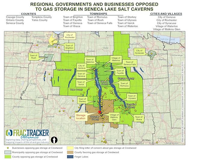At the close of Tuesday night's Board meetings, the Towns of Varick (3-1) and Seneca Falls (unanimous) added their votes against Crestwood's proposed gas storage and transport facility in Schuyler County.On the heels of last month's unanimously passed City of Syracuse Resolution, these additions comprise 21 municipalities surrounding Seneca Lake and throughout the Finger Lakes region, representing nearly 760,000 constituents, who are urging Governor Andrew Cuomo to deny permits for gas storage to Texas-based Crestwood Midstream.