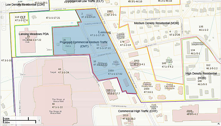 The Village of Lansing is considering changing the zoning of a strip of properties along the west side of Triphammer Road currently designated as a Commercial Low Traffic District to a new designation: Commercial Medium Traffic District. The new zoning would apply ao and area north and south of and including the Ithaca YMCA from Oakcrest Road to just north of Catherwood Rd."This was conceived a year or two ago when we were approached by a developer that wanted to put a hotel on what we used to call the Butler property (an area near the YMCA)," said Planning Board Chairman Mario Tomei. "We would have had to increase the Commercial Low Traffic District to Commercial High Traffic. None of us wanted to do that and all of us felt there was enough Commercial High Traffic property in the Village. After that we had somebody that wanted to put a liquor store there, and recently Eric Goetzmann wanted to put something there and increase it to Commercial High Traffic."