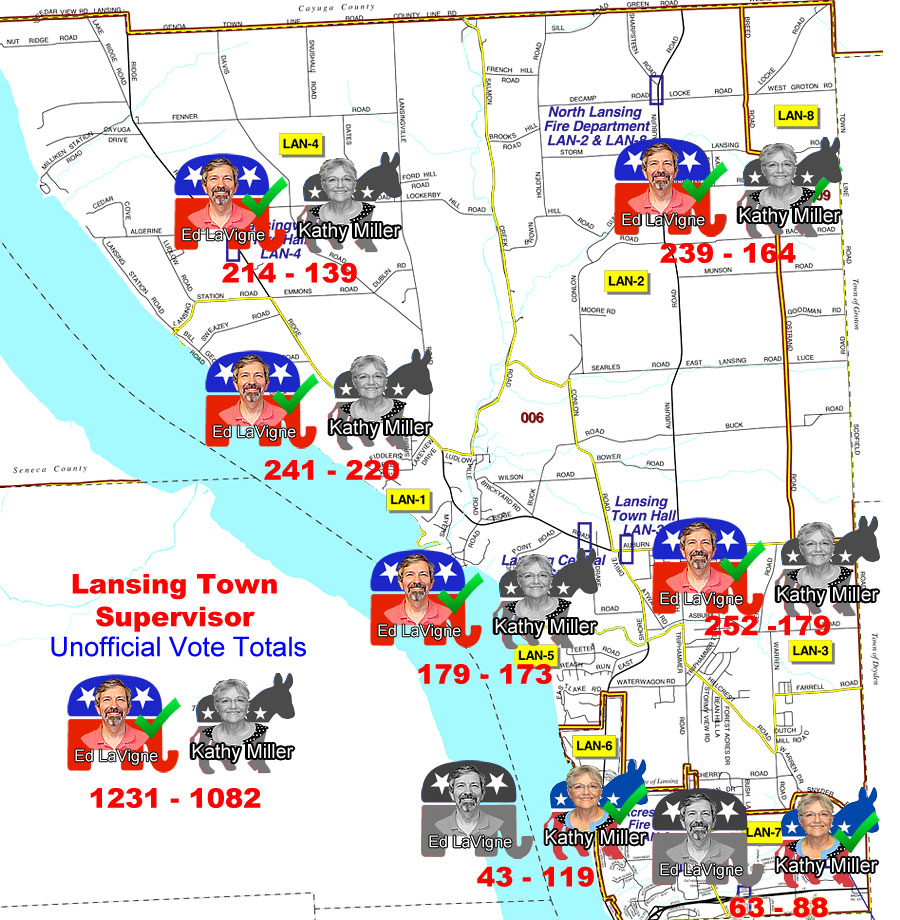Ed LaVigne (R) defeated Kathy Miller (D) 1,231 to 1082 Tuesday to become Lansing's next Supervisor when Miller's term ends at the end of this year. LaVigne won the position in a hotly contested campaign after defeating Chris Williams (R) in the primary election. Even though Katrina Binkewicz (D) and Andra Benson (D) won the two Town Council seats, the Republicans will keep their majority on the Board next year with LaVigne as Supervisor and sitting Councilmen Robert Cree (R) and Doug Dake (R). Almost 35% of Lansing's 6,768 registered voters turned out on Tuesday.Binkewicz got the most votes of candidates for Town Board with 1246. Benson got the second highest number of votes, at 1187. They will fill the two open board seats being vacated by LaVigne and Ruth Hopkins (D). Connie Wilcox (R) received the third highest number of votes at 1140, followed by Rick Hayes (R), who had 1090. This vote count is the 'unofficial result' reported Tuesday before absentee ballots are counted.