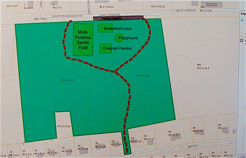 What appears to be a long strip of wooded land starting at the eastern border at Warren Road is actually three properties. The Village plot is in the middle, surrounded by two privately owned properties. Hardaway displayed a rough preliminary plan showing a trail originating at Dart Drive that will lead to a semi-circular trail in the northeast corner of the property. The semi-circle will define the park itself, with the rest of the property let in its natural state.