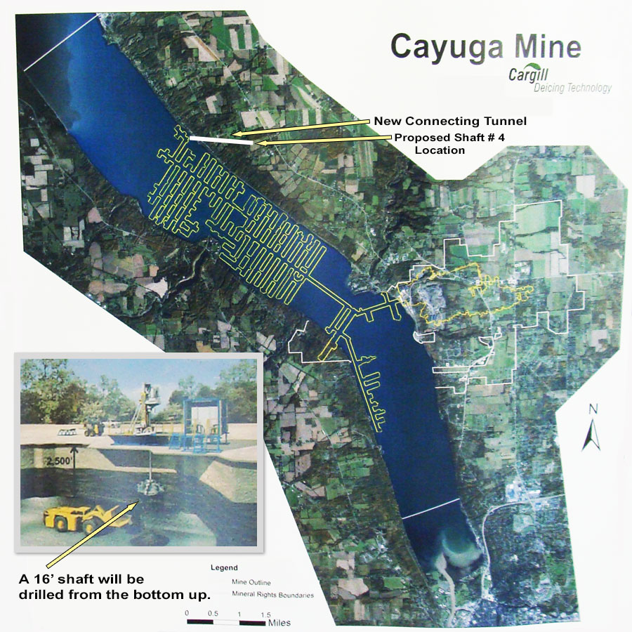 Most of the Cayuga Salt Mine is under Cayuga Lake. (Graphics courtesy of Cargill)"This might be new information for some," he said yesterday. "I don't believe it's new information for Cargill or their geologists for the past 15 years. Those things have been considered. I attended the CLEAN meeting just to make sure that there was no information that came to light that we hadn't considered. I left that meeting quite confident that we had, indeed, done that."He added, "We're always looking 25 to 50 years out. As long as the constituents are going to rely for their safety on road salt Cargill is going to want to be a responsible provider of that. Part of the reason there is so much knowledge is the work Cargill has done from the geological evaluation that goes all the way up there. We're very aware of all the potential issues that could arise. Therefore we're doing mining changes and whatever is necessary to make sure that whatever they fear might happen, we don't cause."