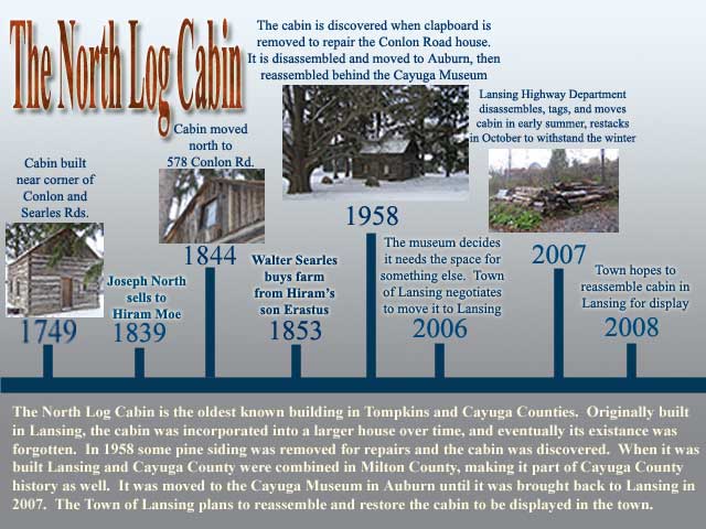 Later that year it was transported to the Cayuga Museum in Auburn, where it was used to house historical displays. When the museum decided to use the space for other purposes last year the Town of Lansing negotiated to bring it home. This summer the Lansing Highway Department disassembled the cabin log by log, tagging each one so that it could be restored later, and transported the logs to a concrete slab near their buildings.